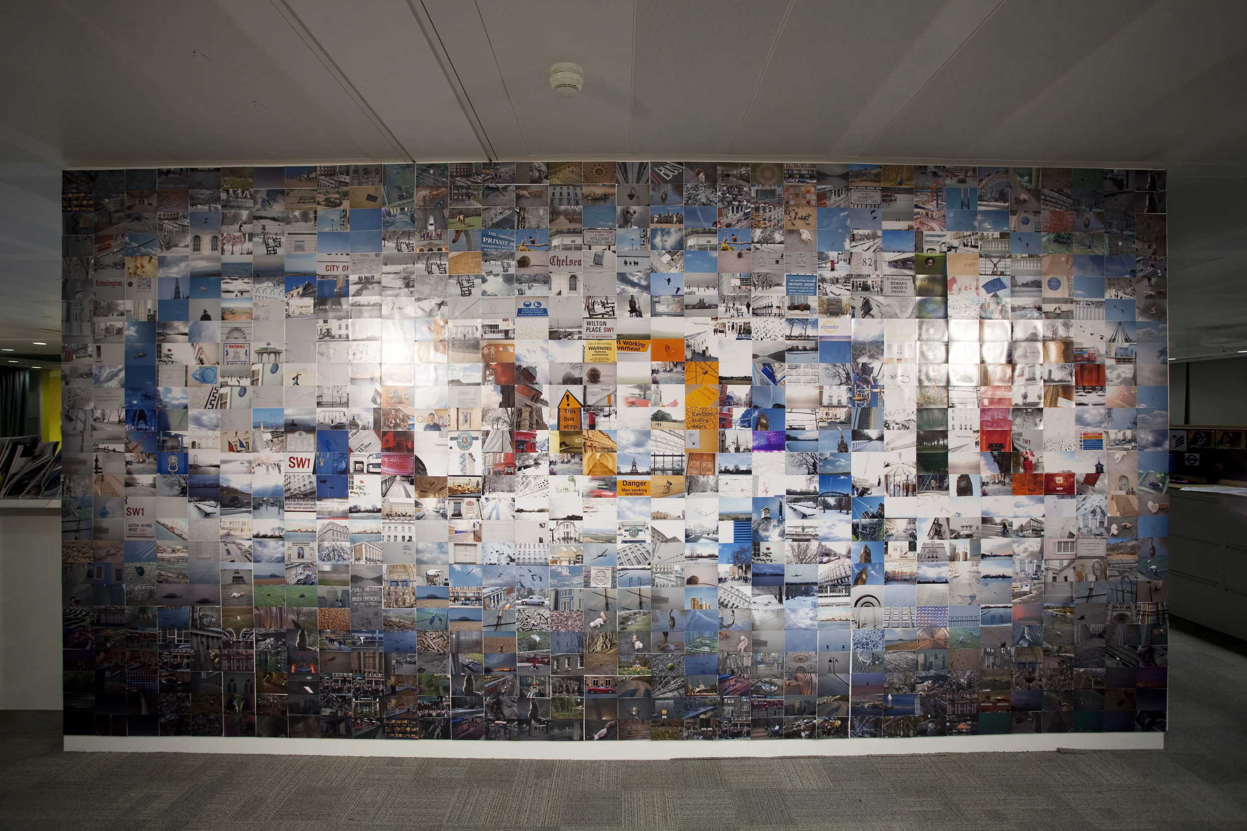 On Thursday night, after many months of planning, and with help of several dozen friends and fellow Googlers, everything finally came together. Using 884 individually printed 4×6 photographs of people, places, and things around the U.K. (all of which were taken by Googlers), a bunch of us in Google’s offices in London created a giant Google logo on a ~10×20 foot wall.